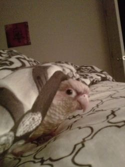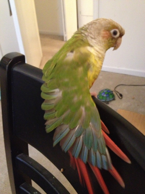 If your bird has chosen you, or anyone else in the household, to be their mate, certain breeding behaviors will be observed. They can be frustrating, painful, and sometimes drive loving bird owners to feel fed up. These behaviors include, but are not limited to; raising of the tail and lowering of the head, inappropriate rubbing on toys, bowls, or hands, small "peeping" type noises, extreme protective behaviors of "mate" including biting, lunging, and attacking others, shredding newspaper and toys, nesting, and regurgitating. In some more extreme cases, and during times of puberty or extreme stress, some parrots rip out their feathers in an attempt to cool off and reduce their raging hormone levels. This plucking is most often done on the feathers under the wings or on the belly on females. Birds who share habits may also rip feathers out of their partners.