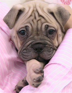 This hybrid dog is a cross between a Chinese Shar-Pei and a Pug. It has the wrinkled skin of the Shar-Pei combined with the outstanding personality of the Pug, all in a smaller sized package than the original Shar-Pei breed. Most American Ori-Peis will weigh under 40 pounds at maturity and typically measure under 16 inches at the shoulder. They have the very short, dense and rather coarse coat of both parent breeds and come in a variety of colors from fawns and creams through to black, gray, brindle and even tan with black markings on the muzzle and ears.
