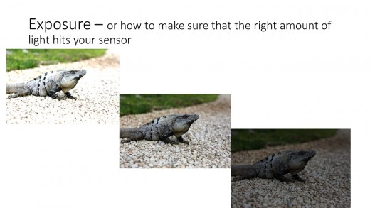 So we start from the sensor being black. The light then hits your sensor turning it gradually lighter and lighter. To get the correct exposure we need to make sure the right amount of light hits the sensor no more nor no less. If you look at the images of the Iguana above; In the right hand image not enough light has hit the sensor (so is termed under-exposed). The central image has the correct exposure and in the left hand image too much light has hit the sensor (so is termed over-exposed).