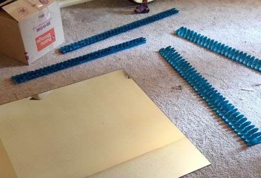Make sure you have measured out 4 posterboard or cardboard strips so that they are long enough to border each side of the mirror and wide enough for your chosen amount of spoon rows
