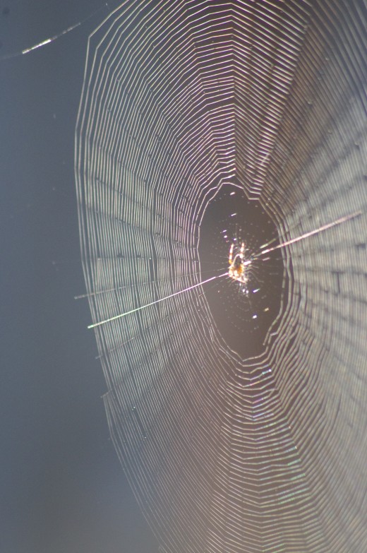 Spiders have evolved a talent for engineering with which similar, yet unrelated bugs, i.e. insects, cannot compete. They spew silk from their abdomens. They don’t create just one type of silk, but up to three different kinds. They make a sticky silk that traps and holds their prey in place. They also produce a non-sticky type of thread that they use to travel across their webs to approach their prey. This allows them to to either eat or bundle up their prey for safe-keeping and consumption at a later time. And for birthing and raising baby spiders, they make a different more secure kind of silk that is used to construct a fortress-like cocoon.