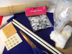 Glue on the legs to the inside front of the tube. Glue the arms to each side at the top. Add stars to the brim and one on the top of the hat.