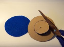 Cut one blue felt circle the size of the tube end (for the hat top to use later) and two blue felt rings the size of the brim.