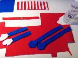 Cut out 2 arms, 2 legs, and 4 shoes out of blue felt. Cut out white hands (4). Glue the hands onto each side of the arms and the shoes onto each side of the legs.