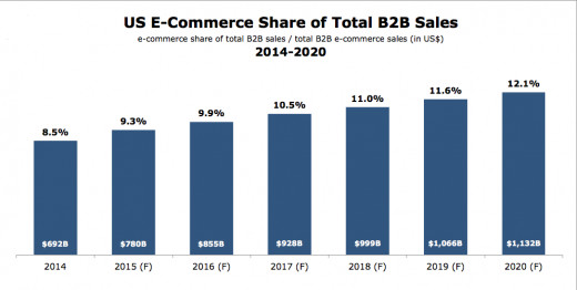 B2B ecommerce sales in the US is expected to grow from $780 billion in 2015 to above $1 trillion in 2020, according to a report by Forrester Research titled U.S. B2B E-Commerce Forecast: 2015 to 2020. The same report projected that businesses purchasing a majority of their work-related goods and services online would grow from 30% in 2015 to 56% in 2017.
