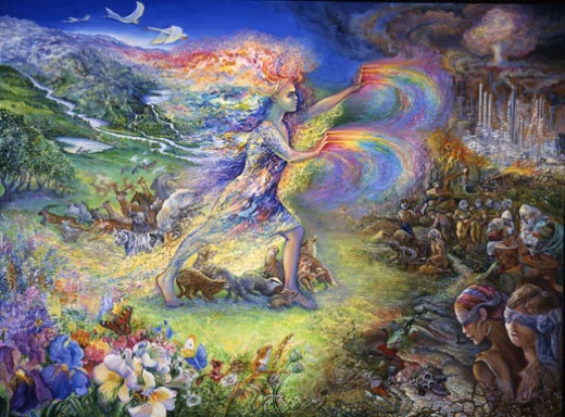 Josephine Wall painted No More as a warning, that if the planet is not taken care of properly it may eventually decide to defend or fight back. I found this painting on a site known as Josephine Wall’s Gallery. All of Mrs. Wall’s paintings have a hidden lesson for people to find and learn from. No More by Josephine Wall shows Gaia, mother Earth, stepping in to protect her creatures from pollution and darkness. The painting, however, may also be about how Gaia has decided to destroy human kind for their destruction of her and her creatures; each section of this painting brings forth different emotions from the observer. I personally feel that the first interpretation is more likely because of the painting is split into two unequal pieces and that the bright colors used on Gaia’s side make Gaia appear more of a savior than a destroyer.