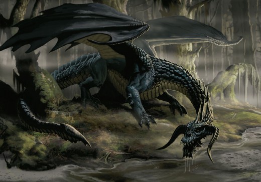 Black Dragons: These dragons are the most vile and vicious of the hordes, they are obsessed with death and the way they look even shows it. The black dragon has somewhat of a skeletal appearance, it's skin seemingly burnt by acid and it smells of rotting flesh and vegetation. This type of dragon is not your friend, said to have a heart blacker then the color of their skin these things live in swamp like lands and have a fondness for eating nearly anything that lives in the water. They roam in the night and have a tendency to surprise attack their prey, they also like to let their victim soak in water for a few days or even weeks, maybe to get some of that good algae flavor. These dragons spit an acid like substance from their mouth, if any creature loves the smell of rotting flesh and vegetation chances are they will not be your friend.