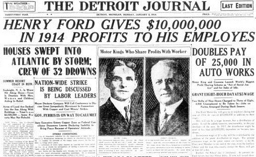 “In 1913, turnover reached an unbelievable 370 percent, and Ford hired more than 50,000 people to maintain an average labor force of about 13,600. When profits swelled, he paid well for labor, creating an uproar when he doubled the basic wage to $ 5.00 a day, which triggered a virtual stampede of job seekers. Paying higher wages for labor was not altruistic in Ford’s eyes. Moreover, it wasn't simply that Ford was trying to pay his workers “enough to buy back the product,” although he did preach a high-wage doctrine after the stock market crash in 1929. Rather, paying relatively high wages was, for Ford, a matter of smart business. He regarded well-paid skilled workers as important as high-grade material. By paying workers well, he effectively lowered his costs because higher wages reduced turnover and the need for constant training of new hires. (At the time, the newspapers saw Ford’s wage increase as an extraordinary gesture of goodwill.)”