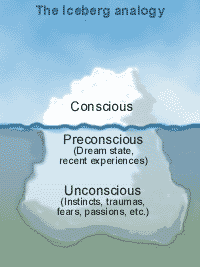 Look to the picture to the right. What does an iceberg have to do with the conscious and unconscious? Note the shape of an iceberg. The top is much smaller in comparison to what is beneath the surface. At the top, exists the conscious. These are all of the facts and actions you are aware of. Your to-do list is here, fresh in your mind.