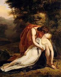 When and where he first met and courted Euridice, isn't totally clear, but evidently no maiden could resist his song. They were married, but their joy was short lived. Directly after their wedding, as she walked in a meadow with her bridesmaids, she was bitten by a viper and died. Orpheus' grief was overwhelming. He decided to go down to the underworld and try to bring Eurydice back. He said to himself: