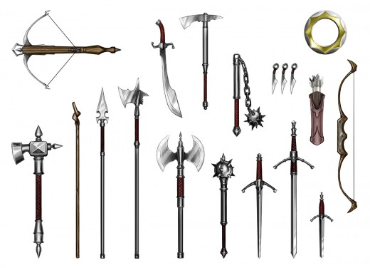 Bows/Crossbow: The preferred weapon of many long range fighters these two weapons give a huge advantage in terms of range and uses, from firing regular arrows to poison tipped ones these two are your best bet if you don't like close encounters. The Bow is known to be able to draw faster but doesn't have as much impact as the crossbow, the crossbow however has some say a further range and better impact but has a longer loading time. The arrows or bolts can be used to snipe from a long ways or assassinate from close up, but they are most useful at a far range. The downside is that they cannot really be used for melee combat, unless you have a squad with you or a secondary weapon you will be left vulnerable.