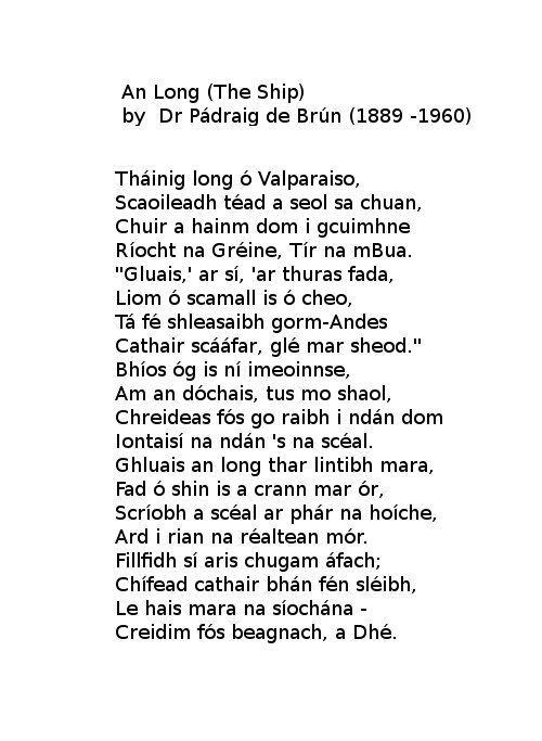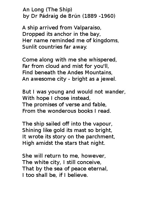 The following poem, by Dr Pádraig de Brún 1889 -1960 called “An Long” in Irish Gaelic, which I first heard in a classroom in Dublin in 1975 by Mr Jack Wade my teacher, says it all so much more eloquently than I ever could...