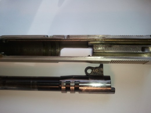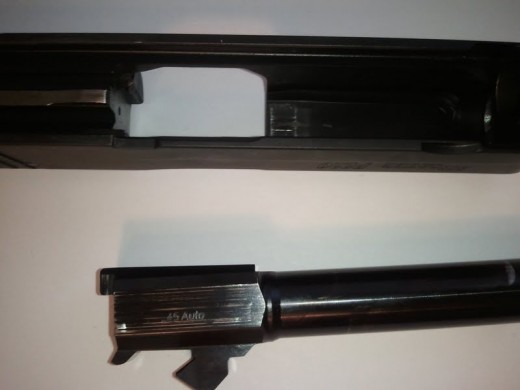 The Sig P226 operates by the locked breech short-recoil method. This means that for a split second the barrel and the slide are locked together during the movement of the slide to the rear. This design is very common in most semi-automatic pistol designs and was invented by John Browning. Although the locked breech was first designed by John Browning, SIG did something a little different. Instead of having locking lugs which lock into place inside of grooves on the slid, the SIG design has an enlarged breech section of the barrel locking into the ejection port.