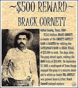 Bill Whitley and Bracket Cornett were two Texas outlaw gang leaders who robbed banks and trains in the late 1880s. Cornett was from Goliad County, Texas, and virtually nothing is known about him before he met Whitley. Even his birth date is unknown.