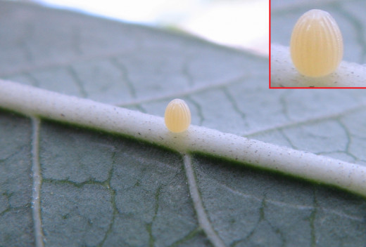 1. Egg Stage - The life of the Monarch begins in a very tiny egg, about the size of a sesame seed, lain by the female Monarch on the underside of Milkweed leaves. This tiny egg contains the budding Monarch larvae, also known as a caterpillar, and will be ready to hatch in a few days. On average, the female Monarch lays close to twenty thousand eggs, all attached firmly to the leaves with sticky secretions from the female Monarch.