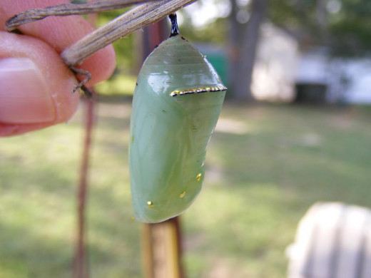 3. Pupa Stage - During this stage, the caterpillar will start seeking out a branch or a twig as prepares to spin itself into a pupa or a cocoon. After it finds a suitable spot, usually on the underside of a twig or branch, it then spins a sticky silk material that will serve as an anchor. As it settles down in a comfortable hanging position, the caterpillar then sheds its skin one last time, uncovering a luscious green pupa with tiny golden spots.