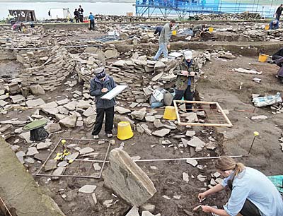 The outline of several stone buildings was revealed and initial excavations were undertaken by William Watt, the laird of Skaill. By 1868, four buildings had been uncovered and "a very rich collection of objects had been deposited in Skaill house."The site then lay largely undisturbed until 1925, when another great storm breached the mound and damaged the previously exposed structures. The buildings were placed under the guardianship of the Commissioners of HM Office of Works, which built a seawall to protect the site. The distinguished archaeologist Vere Gordon Childe led the first professional archaeological investigation of the site between 1927 and 1930 consolidating the damaged structures and uncovering new ones. For the first time, the full extent and remarkable nature of the village was revealed. The seven stone buildings, linked by stone passageways, constituted a clustered village built out of flagstones that were naturally eroded by the ocean. These flags formed from easily worked Devonian Old Red Sandstone. Archeologists believe that these structures were originally roofed with timber and whalebone and enclosed by middens and thatching that completely covered the habitation. Timber was scarce in the area and was likely limited mostly to driftwood, but there was a large supply of flagstones from the nearby ocean already cut to rough size by the tides.