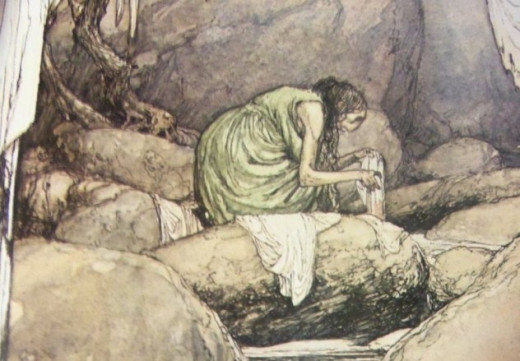 In scottish mythology there is a figure called the bean nighe who was said to foretell the deaths of mortals (she was from the otherworld where sprites,elves,ghosts,and fairies wander). She appears as a washerwoman who cleans the bloody clothes of those fated to die.If you ask politely she will tell you the name of those who will croak. if you are even more polite you can ask her three questions but only if you answer three questions.She is said to appear extremely ugly with webbed feet one tooth and one nostril and occasionally she appears as a beautiful woman .