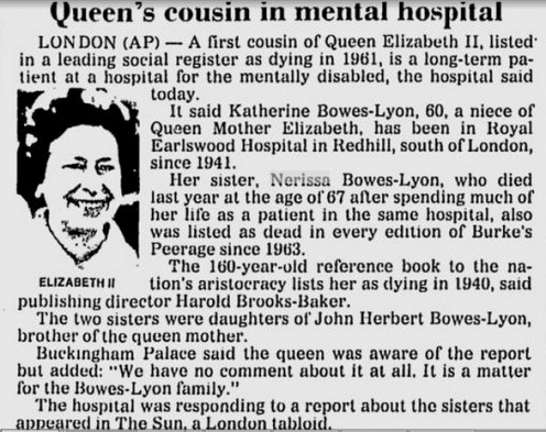 The world heard that two sisters, first cousins of Her Majesty the Queen, had been incarcerated in what was then referred to as 'an asylum for mental defectives' for many years.