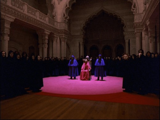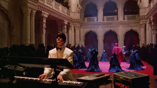 The last piece I’d like to mention is Masked Ball by Jocelyn Pook, who is also the musical director of the film. It is taken from a hymn sung in Romanian, and Jocelyn turned its lyrics backward and got this creepy and ceremony like music. It adds to the dark and satanic atmosphere of the scene a lot. Because we identify with Bill, we get tensed and affected by the ceremony and diegetic music of Jocelyn Pook. Playing backward a hymn may symbolize that in that world Satan rules. We can also say that the reason he goes to that secret satanic orgy is meeting with Nick, he gives him the password and details, and later in that scene, he introduces the ceremony and that world by playing the music there.