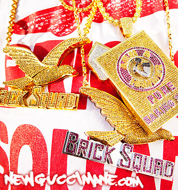 It's very rare to catch Gucci Mane chains missing in any Gucci Mane pictures. From the very start of career when he first signed with Big Cat Records, Gucci has been flaunting his chains. His very first chain was of a big cat holding an emblem reading Big Cat Records. The second chain that he purchased is probably his most famous and well known chain. It's the infamous completely diamond covered Bart Simpson chain. Bart Simpson is even on his skateboard filled with diamonds as well. Two other of his most well known chains include his white and black diamond Odie from Garfield chain and his pink diamond encrusted heart with a bow through it reading 'Da Hood Luv Me.'