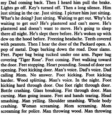 "I heard him pull the brake. Lights go off. Keys turned off. Then a long silence.. Him just sitting in the car. Just sitting. I picture dad just sitting. What's he doing? Just sitting. Waiting to get out. Whys he waiting to get out? He's plastered and cant move. He's plastered and doesn't want to move. The car door opens. Dogs barking down the road. Door slams. Feet. Paper bag being tucked under one arm. Paper bag covering a few glass bottles! Not again. Its happening again! No- Feet coming. Feet stumbling towards door. Feet stopping. STUMBLE BACK SITTING Heart pounding. Sound of door not opening. Foot kicking door. Man's voice. Dads voice. Dad calling mum. No answer. Banging. Dad banging. Dad banging harder. Its 2am. Bottle crashing. Glass breaking. Fist through doORR!!!! Man cursing. Man going insane. Head smashing. Man yelling. Woman screaming. Mum screaming. Whole body crashing. Woman screaming. Mum screaming. Mum screaming for help. Kid scared. Me scared. Man throwing things. Dad throwing up. Mum screaming for help. Dad going crazy. Mum screaming help! Dad shouting LOUDER. Dad going psycho. Mum crying. Scared. Mum saying something. No NO! INTO SCREAM."