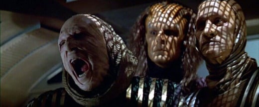 The rejuvenating properties of the metaphasic radiation has an effect on the Enterprise crew - Troi and Riker get frisky, Worf gets a huge pimple on his nose, Geordi no longer needs implants to see properly and Picard starts to dance the mambo.