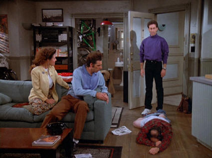 In this episode, Jerry begins dating a woman who doesn't laugh. This is unacceptable because he is a comedian and him dating someone who doesn't laugh would be like... well it's like something. While this is going on, George is dating a woman who is super slim but eats a lot leading George to believe she may be a bulimic. In order to find out if she is "refunding" meals he paid for, George enlists the help of Kramer's mom who is a matron and through this inadvertently discovers that Kramer's first name is Cosmo which is the first time on the show we learn of this.