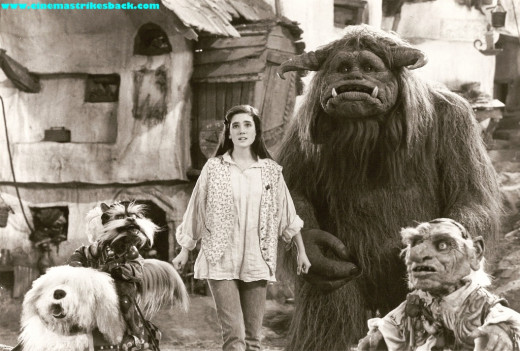 Within the first ten minutes of Labyrinth, we know everything about Sarah Williams (Jennifer Connelly). She is a 15-year-old teenage girl in love with fairytales and the reenactment of her favorite folklores. We also see an argument between her stepmother and her about her tardiness to babysit. She complains to her father about her stepmother, but he doesn’t reinforce the complaint. Soon after this, while she is in her room, we see her mom’s acting scrapbook which features Jareth, the King of the Goblins (David Bowie). That leaves us to wonder or perhaps assume that she is in lust, or maybe even love as she describes it, with her father. So the main character is a teenage girl with a case of Oedipus complex; that sets the stakes for the film’s marginality high. Besides Sarah and Jareth being the only human (well, Jareth for the most part because he is a Goblin) characters, every other character in the film is a puppet. Jim Henson’s puppets were an essential part of the story. A large cast of puppeteers were hired for the film to be the voices and in some instances control the animatronics to every puppet.