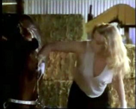 C Thomas Howell is the title character, a loner with no name who rolls into town. When he was just a kid, he witnessed some bad men killing both his parents. Now he is back in town for revenge. In the meantime, he is taken in by Kate ( Sarah Trigger ) and her brother Louie ( Brian Austin Green ) who offer him a place to stay soon after meeting him. The scene in question happens midway into the film. Up to this point we only though of Kate as a good Christian girl, doing the right thing by giving shelter to an apparent homeless drifter. Pretty, but otherwise a nerd. But then one morning the nameless drifter discovers Kate in the stable, washing her horse. This almost falls into the same category as the car washing scenes, but in this case Kate never once gets herself wet. What makes this scene amazing is what she is wearing, and what she is not wearing. Lets start with what she is not wearing. A bra. The T-shirt she is wearing has been cut so that it is just barely holding everything in, and more than once things come close to spilling out. While we never see any nudity, just the sight of Kate in tight pants and that T-shirt, bending over again and again to wash her horse which each time comes close to a wardrobe malfunction, is one of the sexiest scenes to come out of a 90s film.