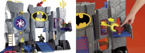 The bat cave has an elevator that stops on all three floors and goes through a hatch on the roof, a slide out rock panel that hides a platform with missile launcher, a front gateway, a side hatch with ramp for the bat-cycle, a see through prison cell, side stairs to a side entrance on the second floor, a winch with hook, ladders, staircases and more.