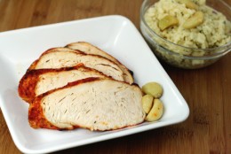 2. Place turkey over rice mixture & sprinkle with paprika. Place the garlic in rice around the Turkey breast.
