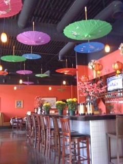The atmosphere in this restaurant is tastefully done, with a cheerful and bright presentation. The windows wrap around the main room, allowing lots of light to enter. It's fun to watch the crowd approach the movie theater. Bright umbrellas of various colors hang from the ceiling, creating a fun look to the decor. Brightly colored walls add an additional flair to the decor. In addition, the bar area is accented with large colorful flowers in a vase. This establishment is not large, but easily able to seat large groups as needed.