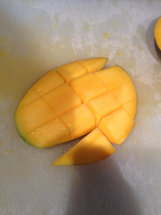 - While the cupcakes are cooling, cut up the mango into cubes (as shown in a picture to the right; click on the thumbnail images to see the picture at a larger size).