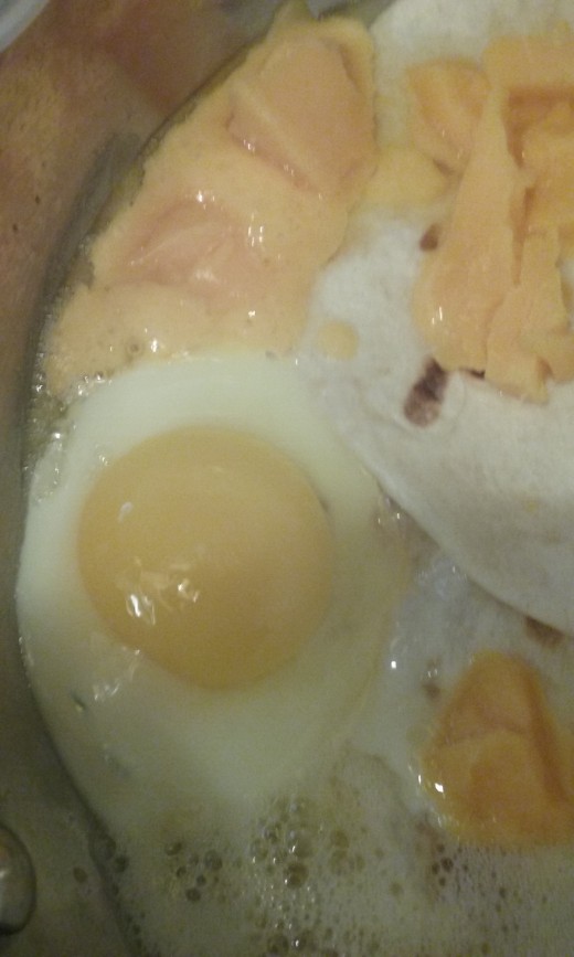 Below is a photo depicting another way that I enjoy having eggs. I enjoy eating fried eggs or Sunnyside up eggs that have some spices on them such as salt, black pepper and crushed red pepper. Prepared this way, the eggs for breakfast can go well with melted cheese and fajita wraps that can readily by purchased at the grocery store.