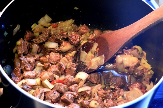 - Chop the onion and leek and chilli to taste and dice the meat. Place the leek and onion in a saucepan with oil and cook gently until the onion is becoming translucent. Add the diced meat and continue cooking until just browned on the outside but not cooked through.