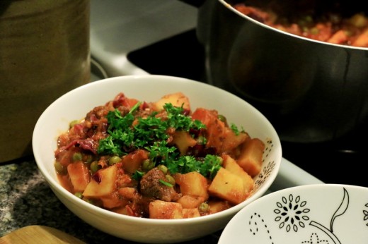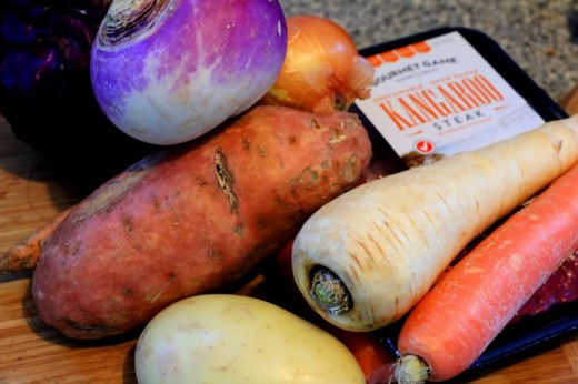 Kangaroo is an extremely lean meat which offers high protein with barely any fat. At the same time it is a relatively sustainable meat in Australia since kangaroos are native and well-adapted to the dry climate (Wilson & Edwards, 2008). Kangaroos are not farmed but live normal free range lives and only a certain quota are taken for meat in order to maintain a sustainable population (for more information you can look at the Macro Meats website at http://gourmetgame.com.au/about/sustainability/). For these reasons kangaroo is one of very few types of meat we eat in our household. The remaining ingredients in the stew are all vegetables; the main component of any healthy and balanced diet and protective against heart disease and some cancers (Block, Patterson, & Subar, 1992; Ness & Powles, 1997), plus a small amount of olive oil (which has its own nutritional benefits, e.g., (Covas et al., 2006)) for cooking the meat and onion. In the osso bucco variation citrus (Parmar & Kar, 2008) is added with potential positive effects on blood sugar, and parsley, high in anti-oxidants (Stuttaford, 1995). When adding rice for the osso bucco the healthiest option is to choose a lower GI rice such as sushi rice or basmati.