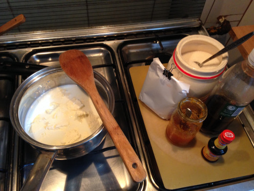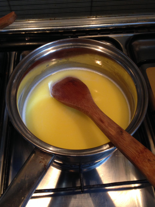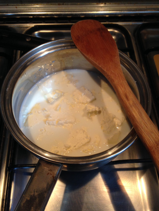 - Chop the butter in small dices, put them in the pot, pour milk over it. Put the pot on the smallest fire of the stove, put the heat on medium, grab your spoon and start stirring, if you are uncomfortable with the amount of heat, turn it down to low, and keep stirring. Make sure the milk or butter don't get burned.