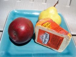 Here we have a regular ol' Bartlett, bought when under-ripe (hard to do otherwise), then kept in a bag for a week. The ripeness is now just about perfect. It's hard to postpone the lunch we are about to make for a week, but the delay is worth it.