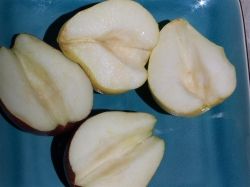 The second looks like an apple, but is actually a Red Pear. Ripened in the same fashion. This pear has a distinctly harder texture than the Bartlett, something which adds to the diversity of this lunch. Makes it more interesting. The difference in texture is not readily apparent when we look at them after the two have been halved and cored, ready for the grill.