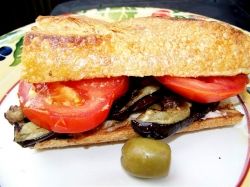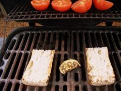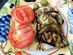 You won't have to wait long for the tomatoes to come along to the party, though. You could wait long enough for them to become really soft and then just mush (moosh) them down on the bread, but we took these off the grill when they were still firm enough to slice. The mushing has the advantage of real immersion in the eggplant; the firmness and the slicing have the advantage of crispness of taste.
