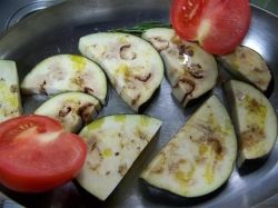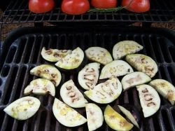 Actually, the eggplant is going to cook so fast this way that you will have these pieces turned over and then off the grill before the tomatoes are fully done.
