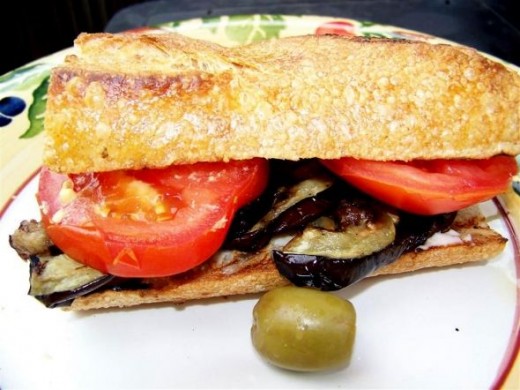 There are several varieties of eggplant, by the way, even ones that are white or yellow. Size varies greatly also. However, the two most frequent types found in the supermarket are the dark purple one we are using here and an elongated, light purple one generally identified as "Chinese eggplant." This sandwich would be just as good with the Chinese one.