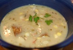 Potato Soup/Chowder Using Homemade Stock, Frozen Garden Corn, Dried Garlic and Herbs