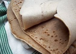 Or lay one injera on each dinner plate, and ladle stew servings on top. Give each person three or more injera, rolled up or folded in quarters, to use for scooping up the stews. I calculated that if you make 15 12-inch injeras, each would be about 120 calories, 3% CFF. For a more authentic injera, add 1/2 cup teff flour (teff is a kind of millet) andReduce the whole wheat flour to 1/4 cup. NOTES: Injera, a spongy crepe-like bread (slightly sour), is almost always eaten with Ethiopian stews.