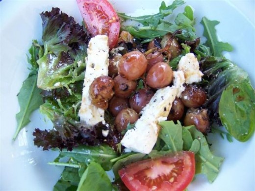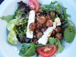 Of course, feta is no surprise in any salad. It is the featured player, the star of the show, in a Greek salad, and it performs its role with distinction. But grapes, grilled grapes in particular, are the novel and distinctive element here. And it is the way they work with the other ingredients (see below) which makes for a very tasty adventure in salad eating.