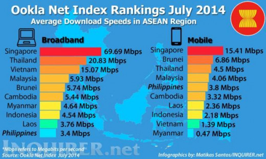 In Poor countries, the ISP's (Internet Service Providers) are just "stealing" money from the user's pockets by giving them higher bills with slow internet connections. One good example is the Philippines, a third world country in Southeast Asia, it has been in the last position in terms of Broadband Speed beaten by Laos, Indonesia and Myanmar despite being the known "Social Media Capital of the World". Philippines has a Download Speed of 3 Mbps with a rank of 158 out of 190 countries worldwide.