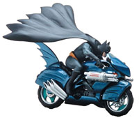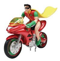 This model was released in 2005 and is the 2000 Film version of Robin;s cycle in 1:16 scale diecast along with a seated Robin figurine.This model has now been discontinued and is quite rare. The model has free-rolling wheels and a kickstand.
