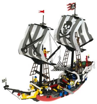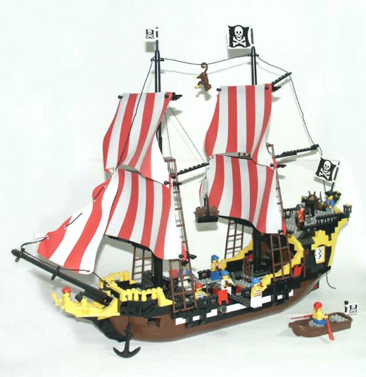 The Black Seas Barracuda set was one of the first Lego Pirates sets released in 1989 and includes a brig with two square-rigged masts, along with 8 minifigures of Captain Redbeard and 7 Pirate minifigures. The set contains a huge 865 pieces.