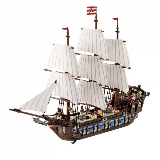 The Imperial Flagship set was released in 2010 and includes a three-masted sailing ship of the Imperial faction from the Pirates theme along with 9 minifigures of the Admiral, the Admiral's daughter, Captain Brickbeard in shackles, the ship’s cook, a lieutenant, and 4 Imperial Guards. The set contains a whopping 1664 pieces.